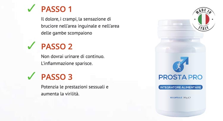 Per venire incontro a molte di queste problematiche senza caricare l’organismo di medicinali, è stato lanciato sul mercato un integratore composto totalmente da ingredienti naturali che va ad agire direttamente sulle infiammazioni che colpiscono la prostata e i relativi sintomi che si manifestano a livello urinario e sessuale. Il nome di questo integratore è Prosta Pro, si presenta sotto forma di comode e pratiche capsule e allevia in breve tempo quelli che sono i classici disturbi collegati ad una cattiva funzionalità prostatica: flusso urinario debole e discontinuo, minzione frequente e dolorosa, ristagni di urina nella vescica a causa di uno svuotamento incompleto e disfunzione erettile dovuta ad una scorretta produzione di liquido seminale.